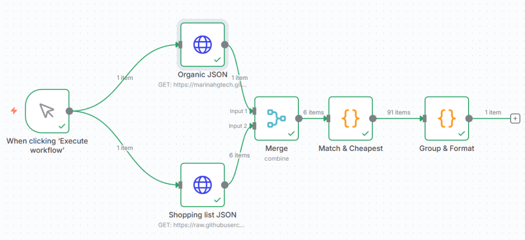 Once the data was ready, I built an n8n workflow that connects this dataset with my weekly shopping list.